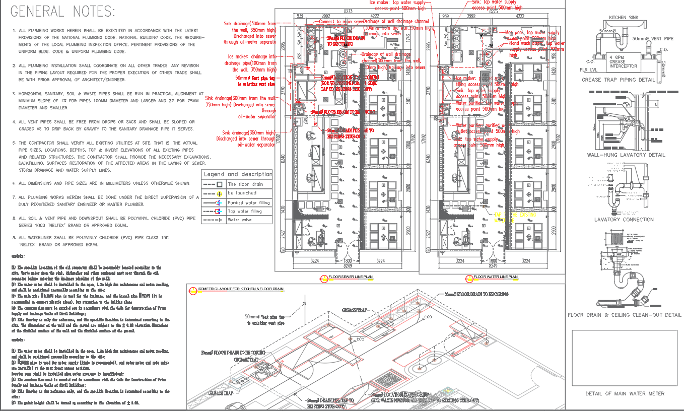 Explore the intricacies of a 141 sqm restaurant's plumbing system with our meticulously crafted AutoCAD file. Dive into the details of the floor sewer line and water line plans, revealing the seamless integration of essential elements. Navigate through the isometric layout for the kitchen and floor plan, gaining insights into the efficient arrangement of plumbing components. Discover the precision of the grease trap piping, wall-hung lavatory, lavatory connection, and floor drain with ceiling cleanout details. This CAD drawing provides a comprehensive guide, ensuring a smooth flow of plumbing functionality in the restaurant space. Download the DWG file to access these detailed plans and elevate your project with precision and ease.