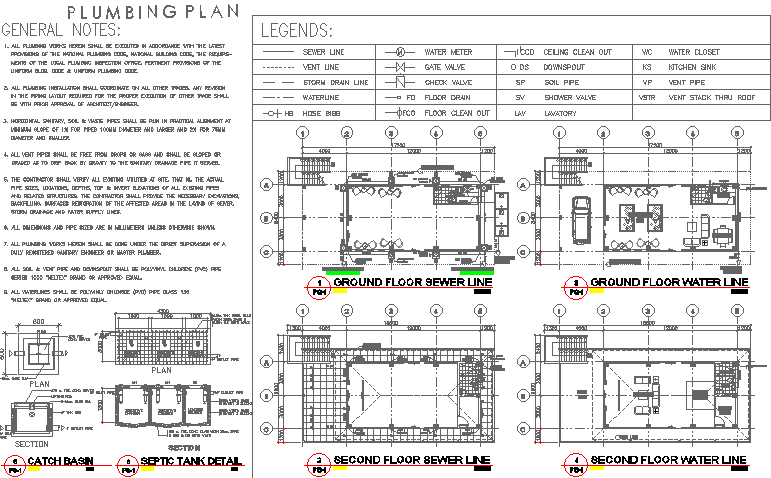 Discover a comprehensive AutoCAD DWG drawing showcasing the plumbing plan meticulously designed for a two-floor building, complete with detailed legends and general notes. This detailed drawing offers insights into the layout and installation of plumbing systems, including ground floor sewer lines, ground floor water lines, first floor sewer lines, and first floor water lines. Additionally, specific features such as septic tank details and catch basins are meticulously depicted, ensuring efficient waste disposal and water distribution throughout the building. With a focus on precision and functionality, this drawing serves as an invaluable resource for architects, engineers, and plumbers, facilitating seamless coordination and implementation of plumbing systems in the construction process. Accessible as CAD files, it provides a comprehensive guide for ensuring optimal performance and longevity of the building's plumbing infrastructure.