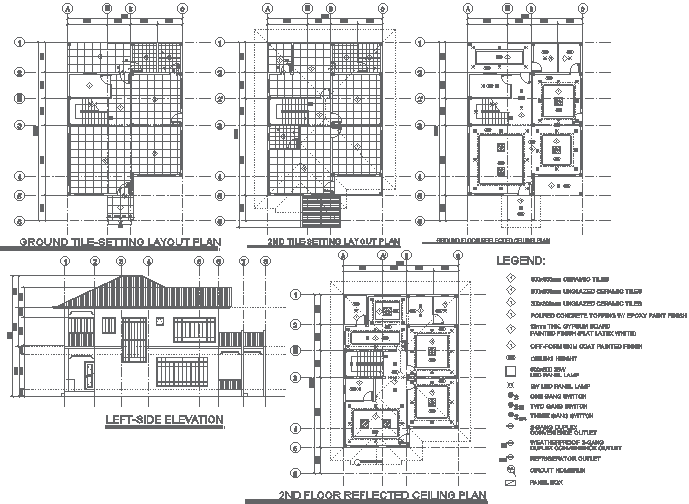 Explore a comprehensive AutoCAD DWG drawing showcasing the architectural plan for a spacious 3 BHK house with a family room, complete with detailed floor and ceiling details. This meticulously designed drawing offers insights into the floor plan layout, including first-floor and ground-floor furniture arrangements, ensuring optimal space utilization and functionality. Additionally, the drawing includes a reflected ceiling layout, providing a clear depiction of lighting fixtures and other ceiling elements. With meticulous attention to detail, the drawing also features tile setting layouts to guide the installation of flooring materials. Elevation views offer a comprehensive understanding of the building's exterior design. Accessible as CAD files, this drawing serves as an invaluable resource for architects and designers, facilitating seamless coordination and implementation of architectural elements in the construction process.