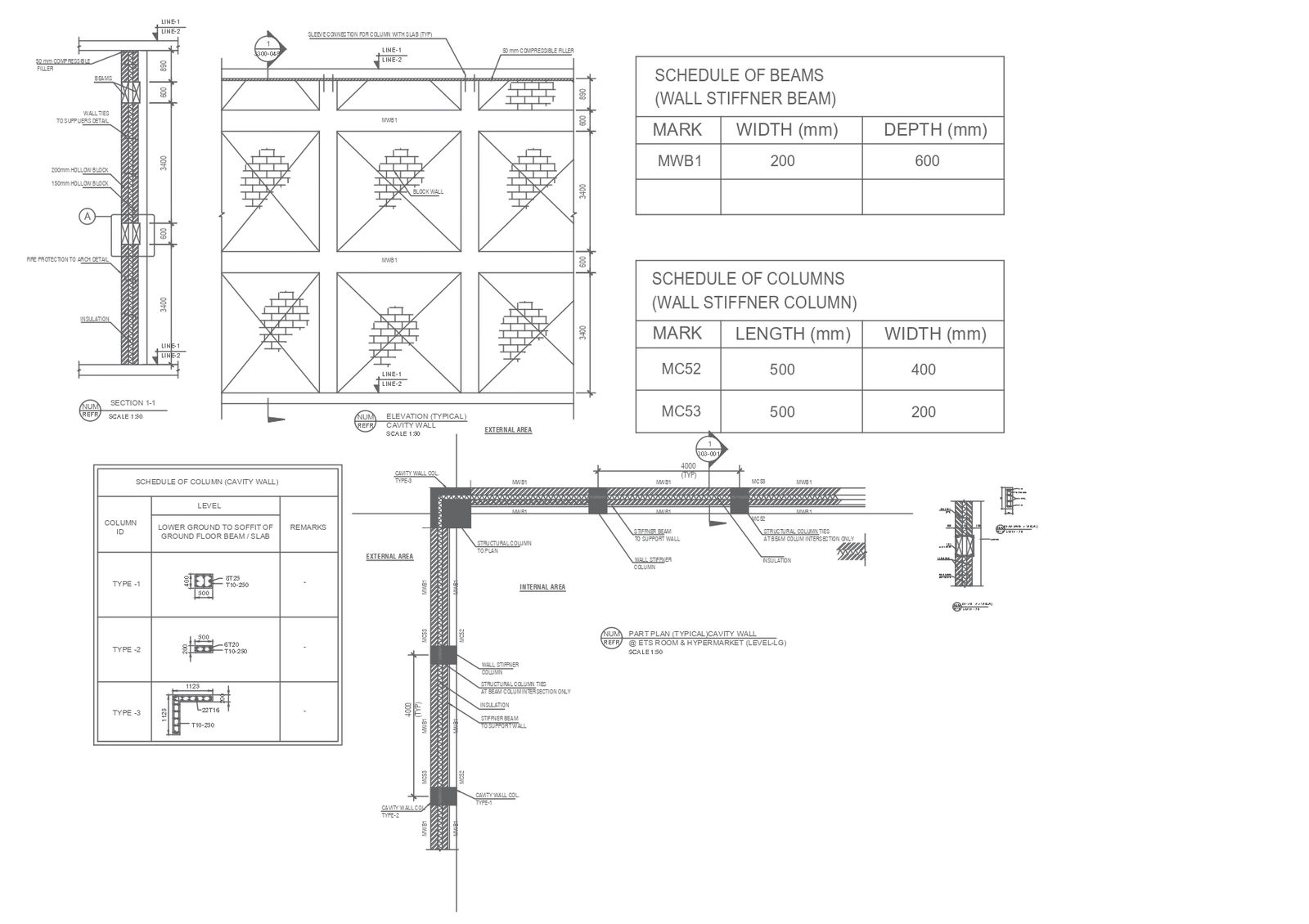 mallet room beam schedule with plan part (typical) cavity wall and sleeve connection for column and elevation of cavity wall dwg autocad drawing with key plan.