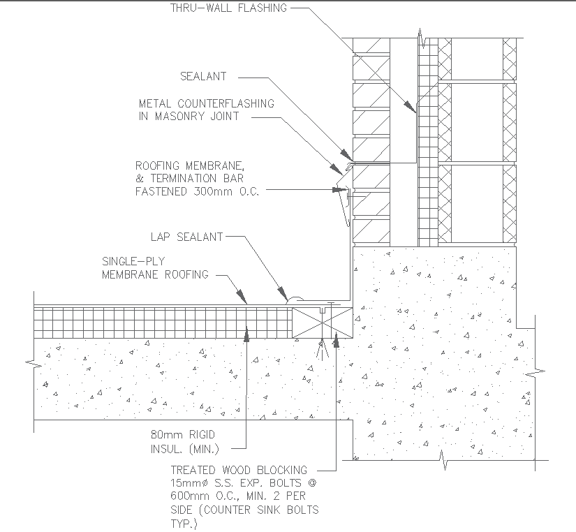 Explore a detailed AutoCAD DWG drawing depicting the junction detail between the roof and wall, specifically designed for single-ply membrane roofing systems. This comprehensive drawing provides insights into the installation process, including elements such as thru-wall flashing, sealants, metal counterflashing, and termination bars fastened within masonry joints. Additionally, it may feature specifications for lap sealants and rigid insulators, ensuring proper sealing and insulation for the roofing system. Architects, engineers, and contractors can utilize this drawing to ensure accurate installation and sealing of roof and wall junctions. Accessible as a 2D AutoCAD drawing in DWG format, this file serves as a valuable resource for professionals involved in construction projects, facilitating seamless coordination and implementation of critical details for optimal performance and longevity of single-ply membrane roofing systems.
