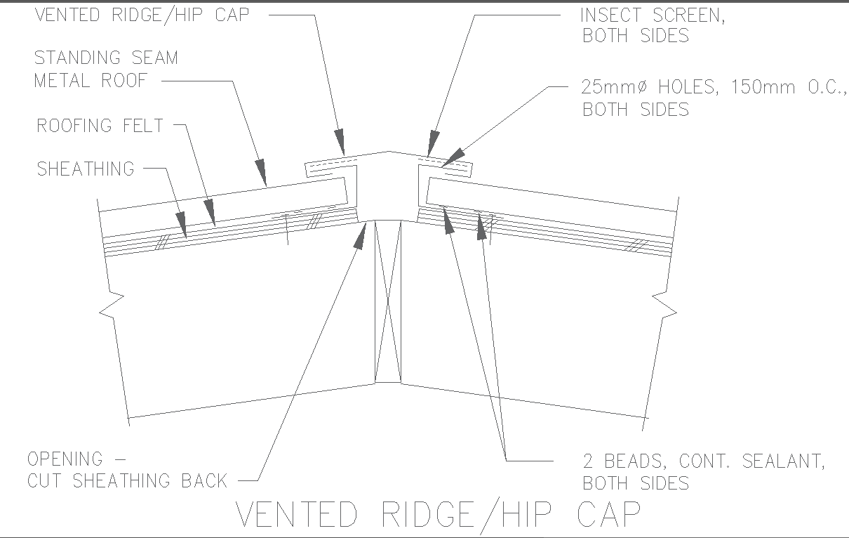 Discover a detailed AutoCAD DWG drawing featuring the vented ridge hip cap detail, complete with an insect screen, designed for standing seam metal roofs. This drawing provides valuable insights into the installation of vented ridges and hip caps, ensuring proper ventilation and protection against insects. Additionally, it includes specifications for roofing felt and sheathing, with openings cut into the sheathing to accommodate the installation. The drawing also showcases insect screens on both sides, effectively preventing insect infiltration, along with holes on both sides to facilitate ventilation. Architects, engineers, and contractors can utilize this drawing to ensure precise installation and functionality of vented ridge hip caps with insect screens, facilitating seamless coordination and implementation of critical details for optimal performance. Accessible as a 2D AutoCAD drawing in DWG format, this file serves as a valuable resource for professionals involved in construction projects, facilitating seamless coordination and implementation of critical details for optimal performance and longevity.