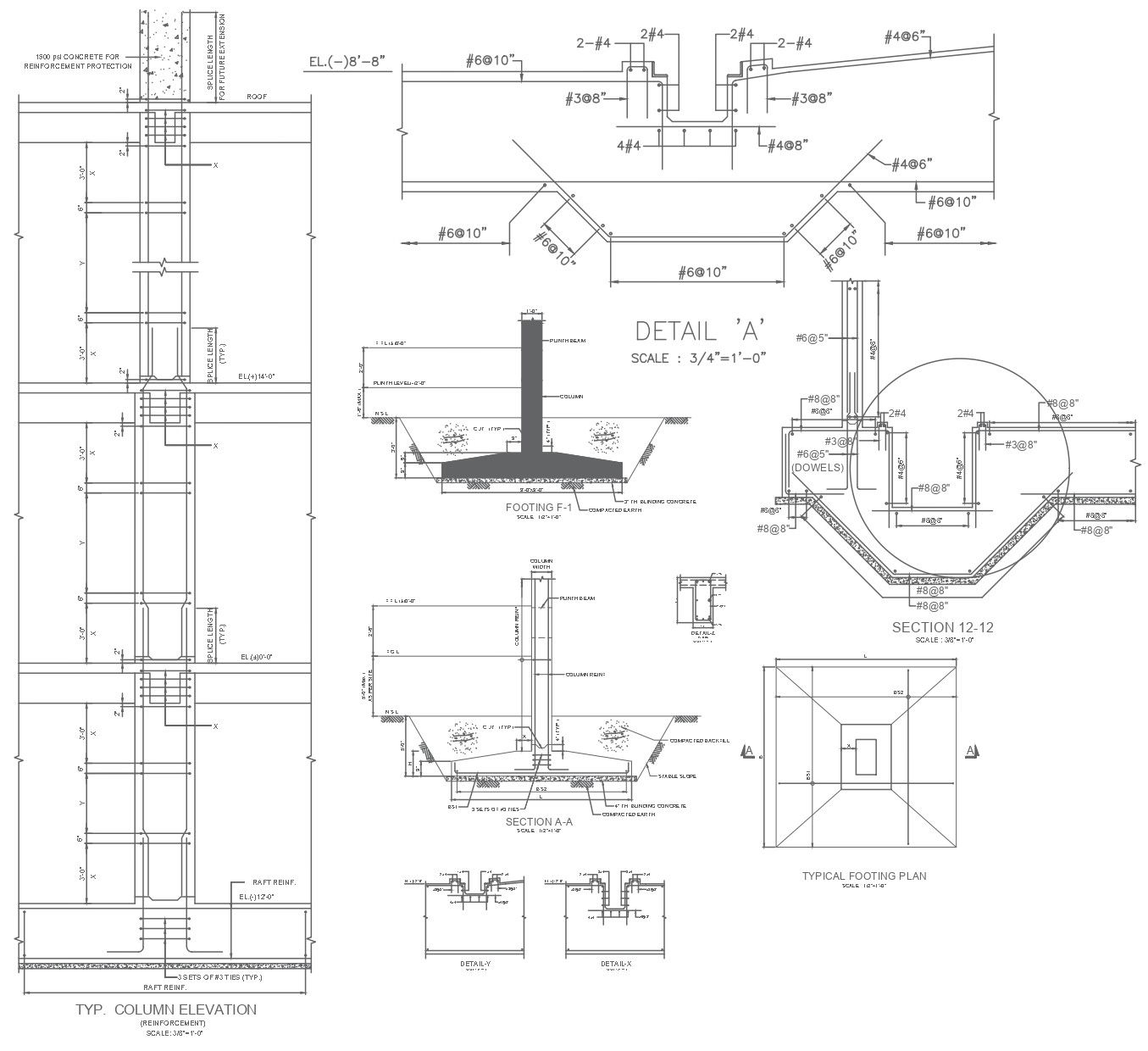 Raft foundation reinforcement plan at level -16feet and fire fighting tank with all elevation section and other detail AutoCAD dwg drawing