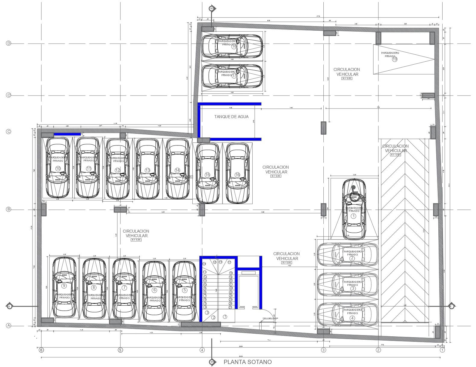 Discover the detailed parking plan for a multistory building with elevation, section, and column layout in this AutoCAD DWG drawing. This drawing provides a comprehensive view of the circulation space, parking slots, including designated areas for handicap parking, and clearly marked exit and entry points. With meticulous attention to detail, the drawing ensures efficient utilization of space and smooth traffic flow within the parking structure. Accessible in DWG format, it serves as a valuable resource for architects and designers involved in multistory building projects, offering insights into parking layout and design.