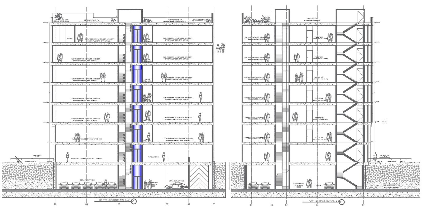 Multistorey Building Design with Parking Section and all floor section DWG AutoCAD Drawing