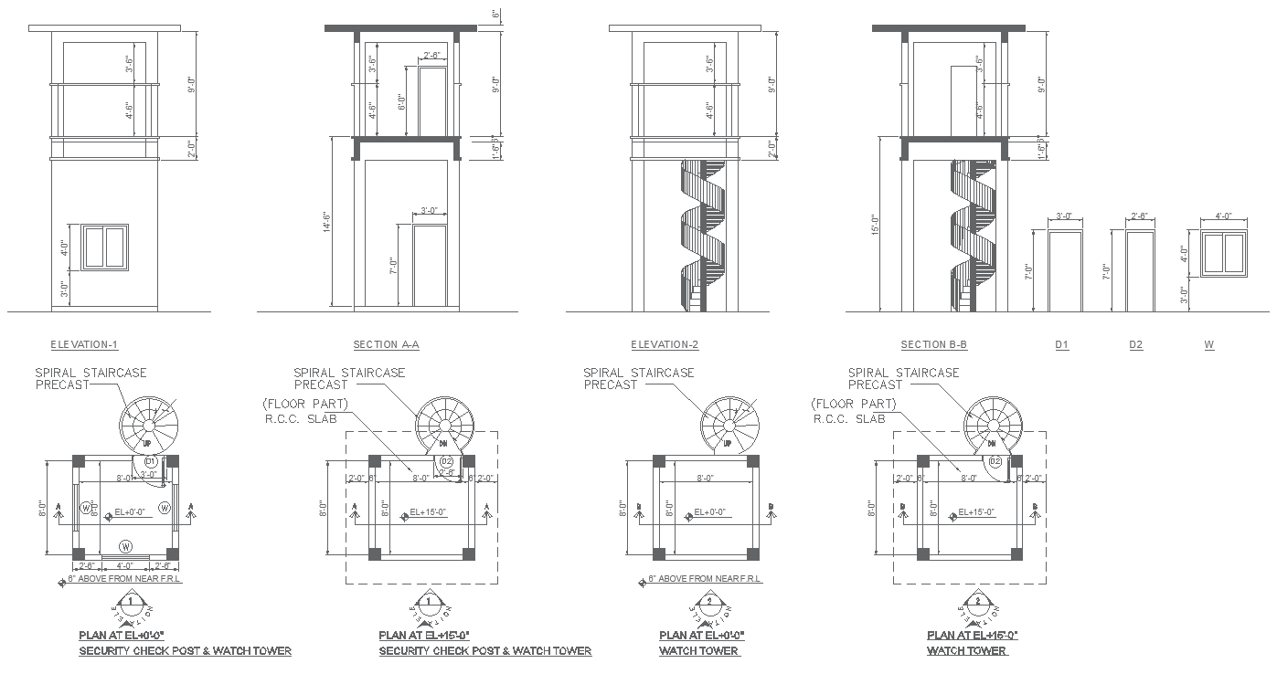 Explore the comprehensive design of a watchtower in this AutoCAD DWG drawing, featuring detailed elevations, sections, and floor plans. The drawing includes intricate stair details, particularly focusing on a spiral staircase precast for efficient access to all floors. With dimensions provided, architects and designers can accurately assess the layout and dimensions of the watchtower. Ideal for security checkposts and surveillance facilities, this drawing offers valuable insights for planning and visualization, making it a valuable resource for architectural projects.