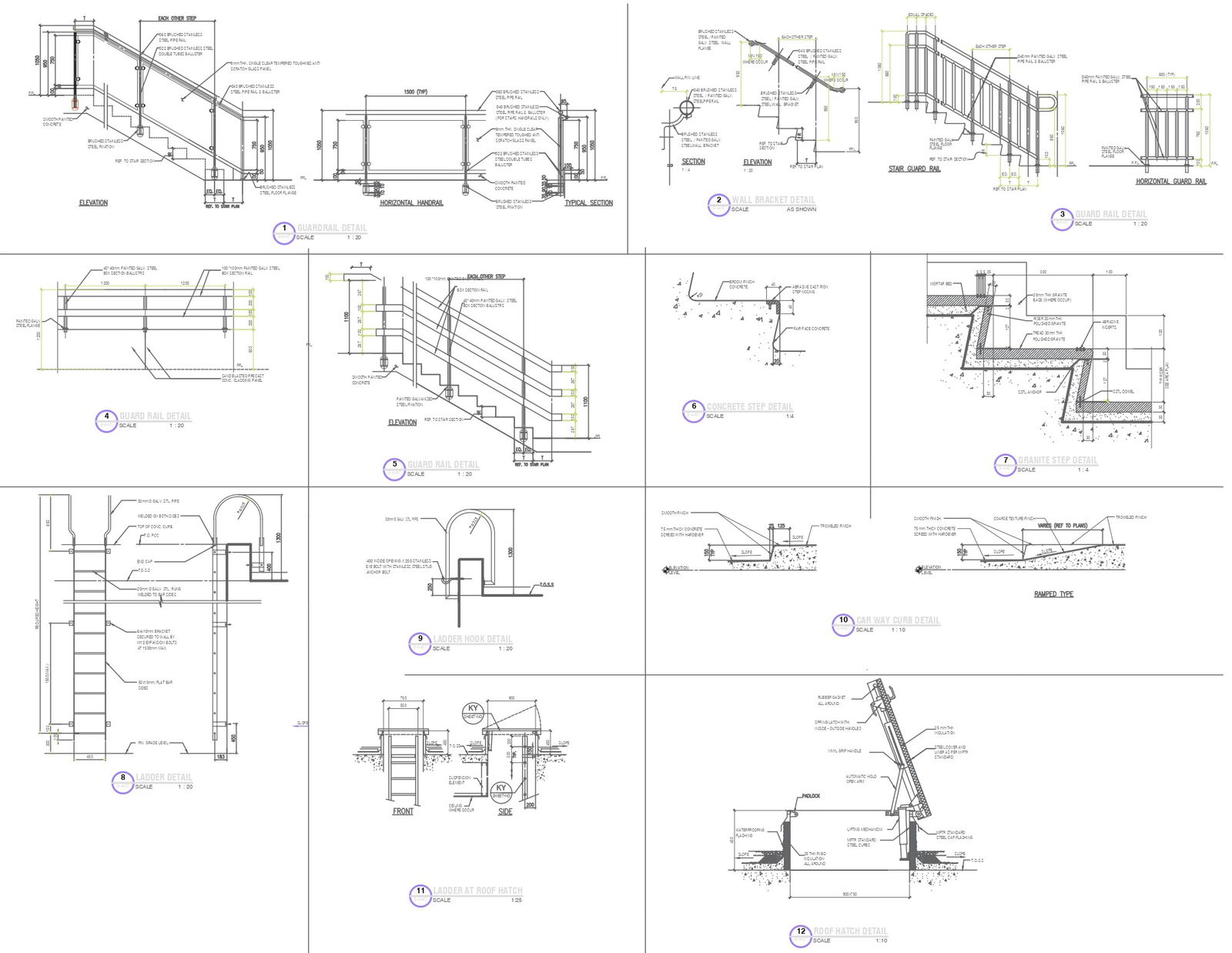 Explore the intricacies of stair and railing design with our comprehensive Railing and Stairs Detail DWG AutoCAD drawing. This drawing provides a detailed depiction of stair and railing elements, including elevation and section views, meticulously crafted to ensure accuracy and functionality. Delve into the ladder detail, showcasing front and side ladder designs with precision. Additionally, discover the roof hatch detail, guard detail, concrete detail, granite step detail, and wall bracket detail, offering a comprehensive overview of the structural components involved. Whether you're an architect, engineer, or designer, this drawing serves as a valuable resource for planning and implementing stair and railing systems with precision and efficiency. Elevate your project with our Railing and Stairs Detail DWG AutoCAD drawing, where innovation meets functionality to deliver exceptional design solutions.