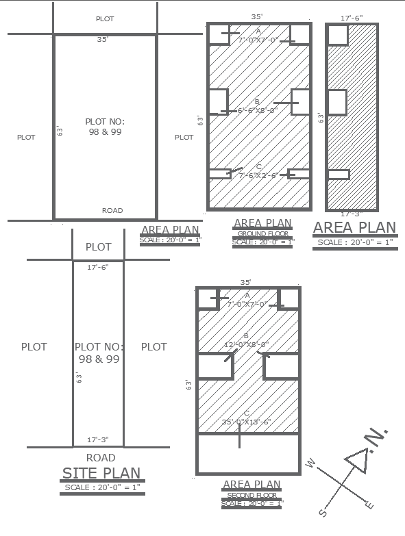 This AutoCAD drawing presents a comprehensive site plan and space analysis of plots 99 and 98, detailing the ground, first, and second floors. With a focus on site analysis and area planning, it provides valuable insights into the layout and distribution of spaces within the designated area. The drawing includes crucial elements such as roadways, indicating the plot's connectivity and accessibility. Each floor is meticulously depicted, offering a clear view of the spatial organization and allocation of different functions. Additionally, the inclusion of directional indicators, such as the north direction, enhances the drawing's usability and helps stakeholders orient themselves within the site. Whether for architectural design, urban planning, or development purposes, this drawing serves as a valuable resource for understanding the spatial dynamics and potential of the plots in question.