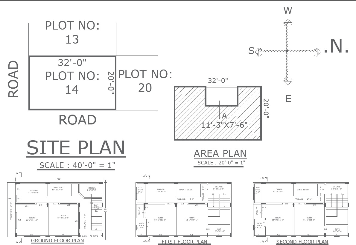 Site plan and space analysis for house plan with ground floor plan first floor plan and second floor plan detail dwg autocad drawing .