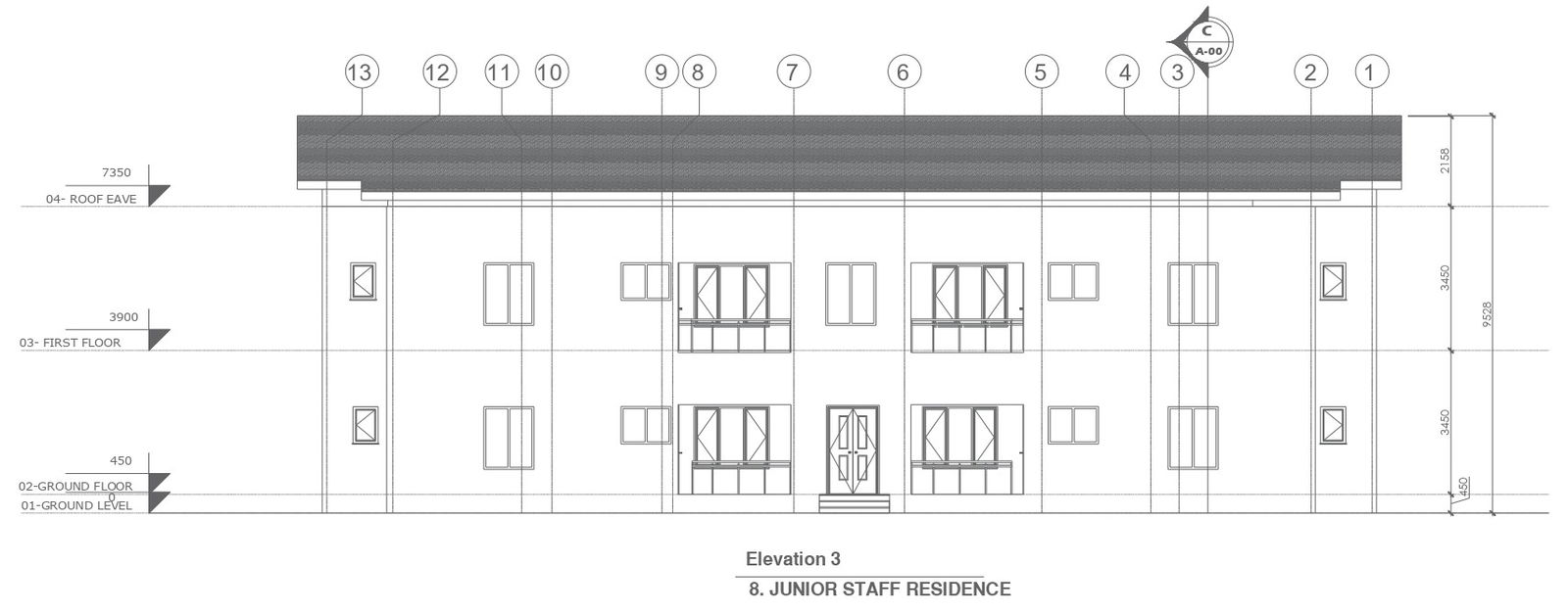This AutoCAD drawing presents the elevation of a junior staff residence, offering a detailed depiction of the exterior design elements, including door and window details, as well as floor levels. The elevation provides a comprehensive view of the architectural features, allowing for a clear understanding of the building's facade. With precise door and window specifications, viewers can assess the entry points and natural lighting provisions of the residence. Additionally, the depiction of floor levels aids in understanding the vertical dimension of the structure. Whether for architectural planning, construction purposes, or visual presentation, this drawing serves as a valuable resource for architects, builders, and designers. By showcasing key design elements and structural details, it facilitates the visualization and execution of the junior staff residence project.
