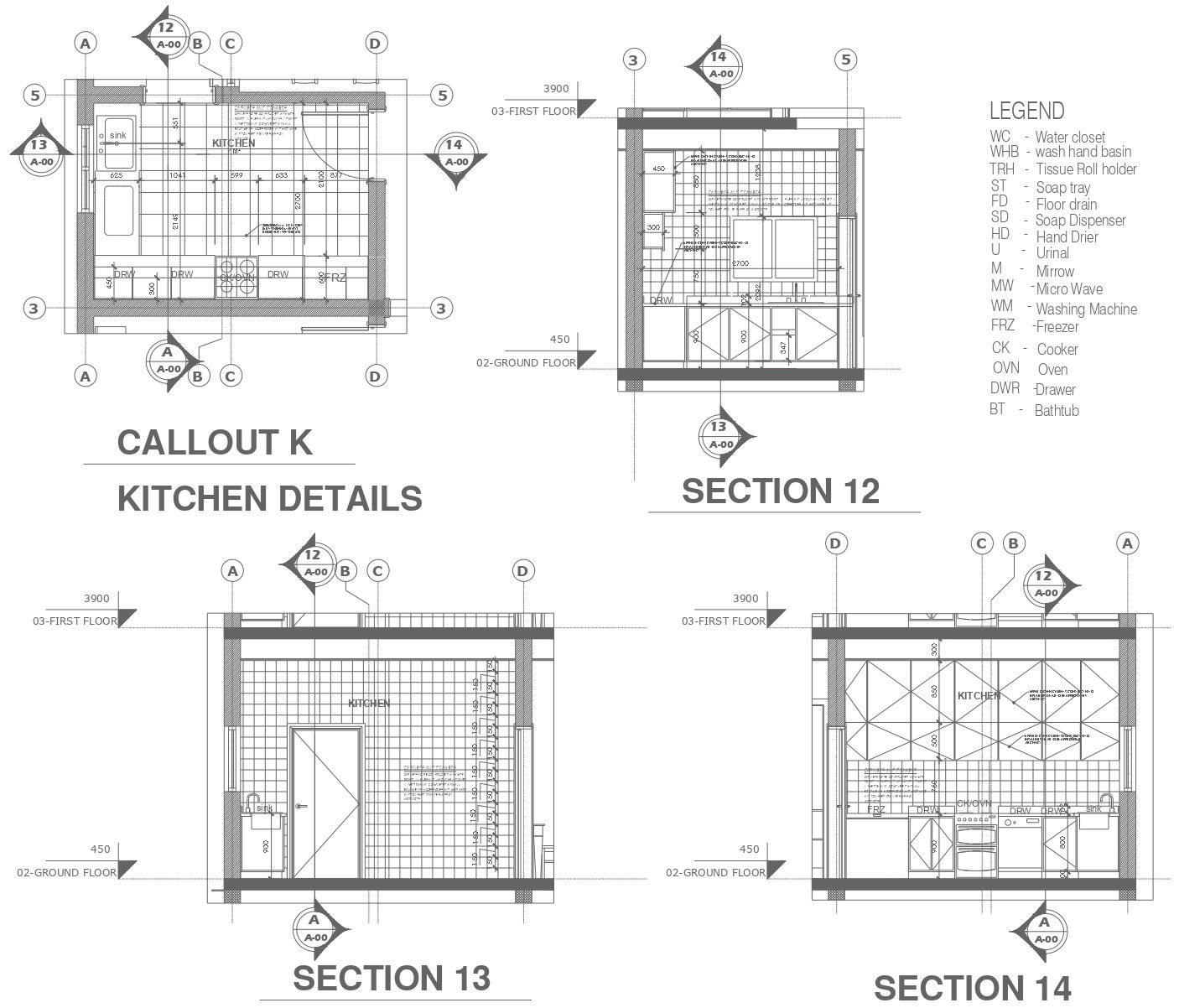 Callout kitchen detail elevation and flooring layout of house plan dwg autocad drawing .