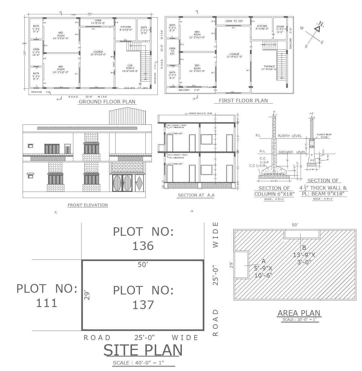 4 BHK Residential Building Floor Plan With Front Elevation and Section Detail AutoCAD File