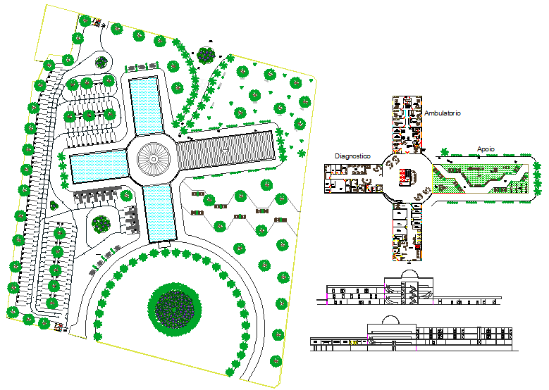 Hospital's architecture layout with detailing and dimensions, floor plan, furniture layout, section cutting plan, structural layout, sectional elevation of individual floor, exterior elevation, exterior landscaping, constructional details.
