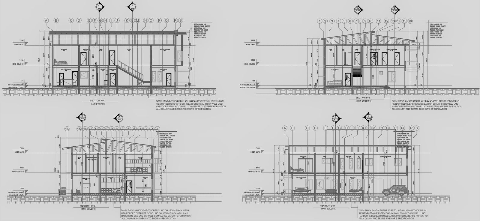 Explore the intricacies of a 4 BHK house plan with this detailed AutoCAD DWG drawing, focusing specifically on the section detail. Every aspect of the section, from the foundation and column center lines to the beam and door details, is meticulously depicted, providing valuable insights for architects, engineers, and designers. With precise dimensions and comprehensive interior detailing, this drawing offers a holistic view of the house's structural layout and furniture arrangement. Whether for architectural analysis, construction planning, or design reference, this drawing serves as a valuable resource. Gain a deeper understanding of the house's architecture and interior design elements, including furniture placement and door configurations. With its meticulous depiction of section lines and detailed furniture and door details, this AutoCAD drawing facilitates seamless execution and enhances the efficiency of architectural projects.