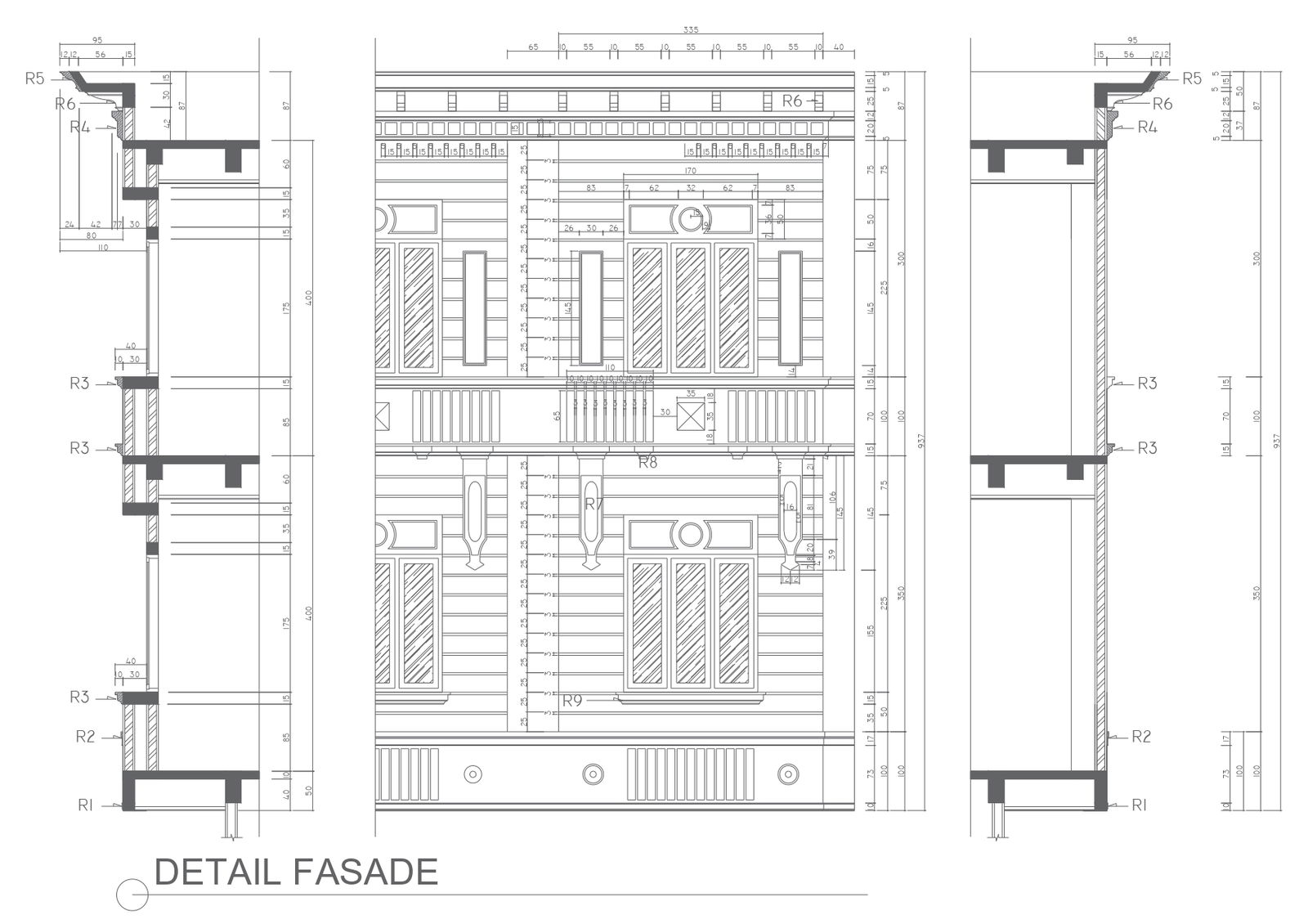 Detailed facade design for hotel and restaurant design dwg autocad drawing .