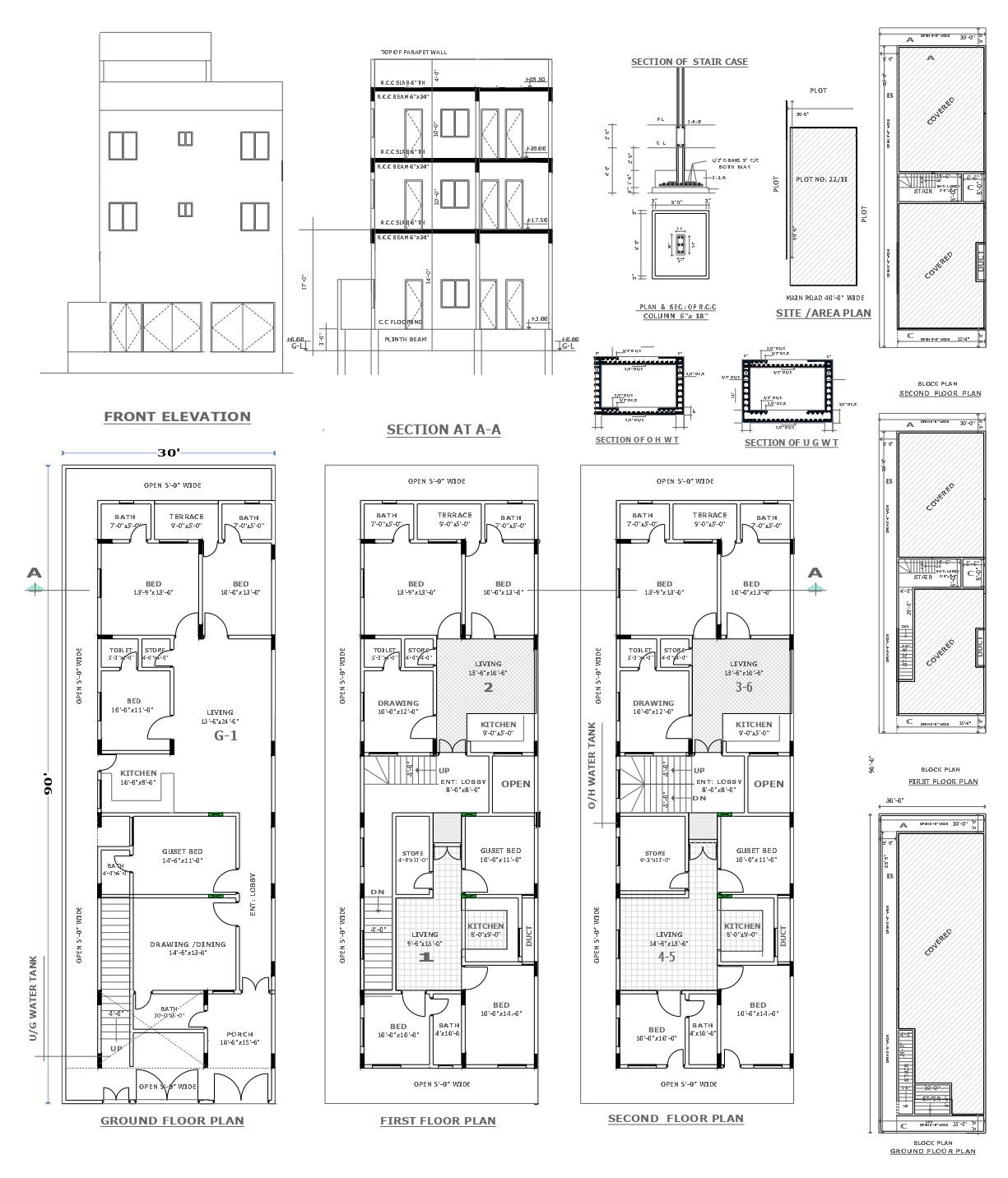 90 x 30 feet plot size house plan with elevation section first floor second floor detailed plan dwg autocad drawing .