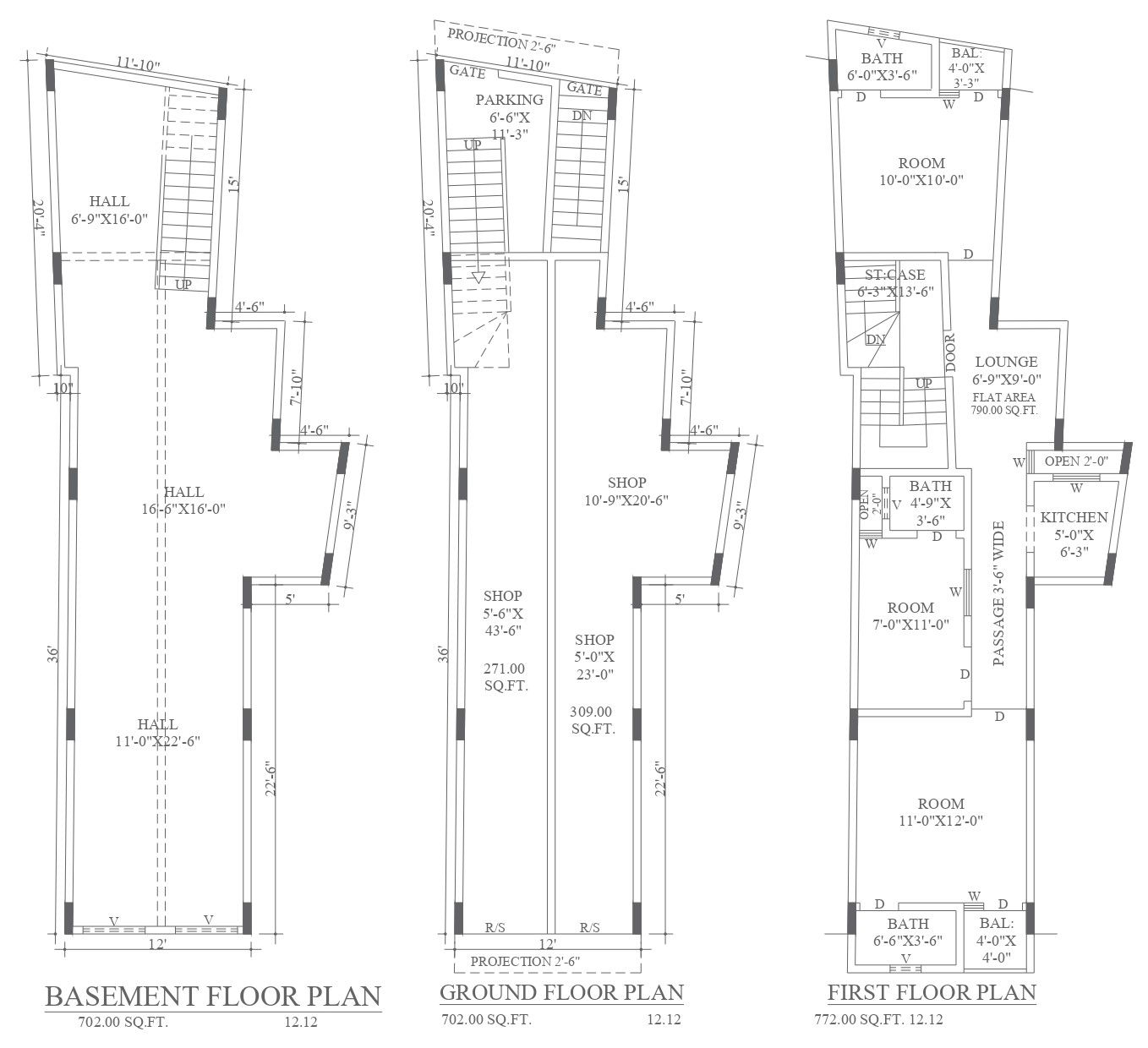 Basement Floor Plan with Ground Floor Shop Plan and First Floor Residential Plan Detail in DWG File