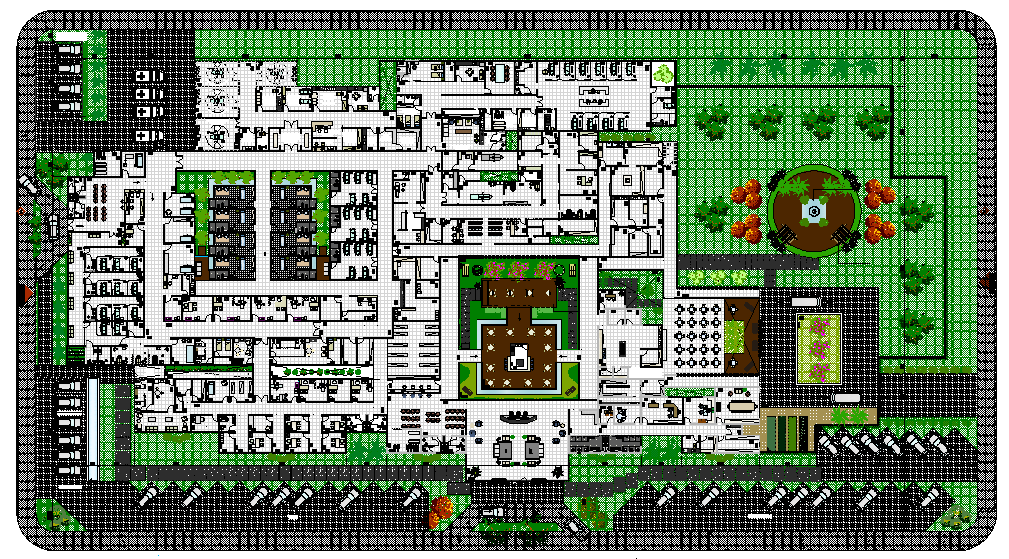 Hospital's architecture layout with detailing and dimensions, floor plan, furniture layout, section cutting plan, structural layout, sectional elevation of individual floor, exterior elevation, exterior landscaping, car parking facilities.