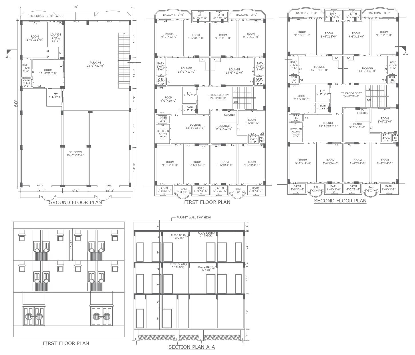 Floor Plan With Front Elevation and Section Detail of 3-Storey Building In DWG File