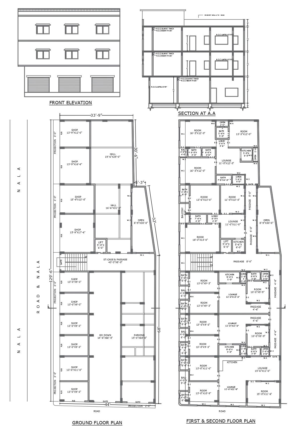 Flats over commercial shops design with elevation and section details dwg autocad drawing .
