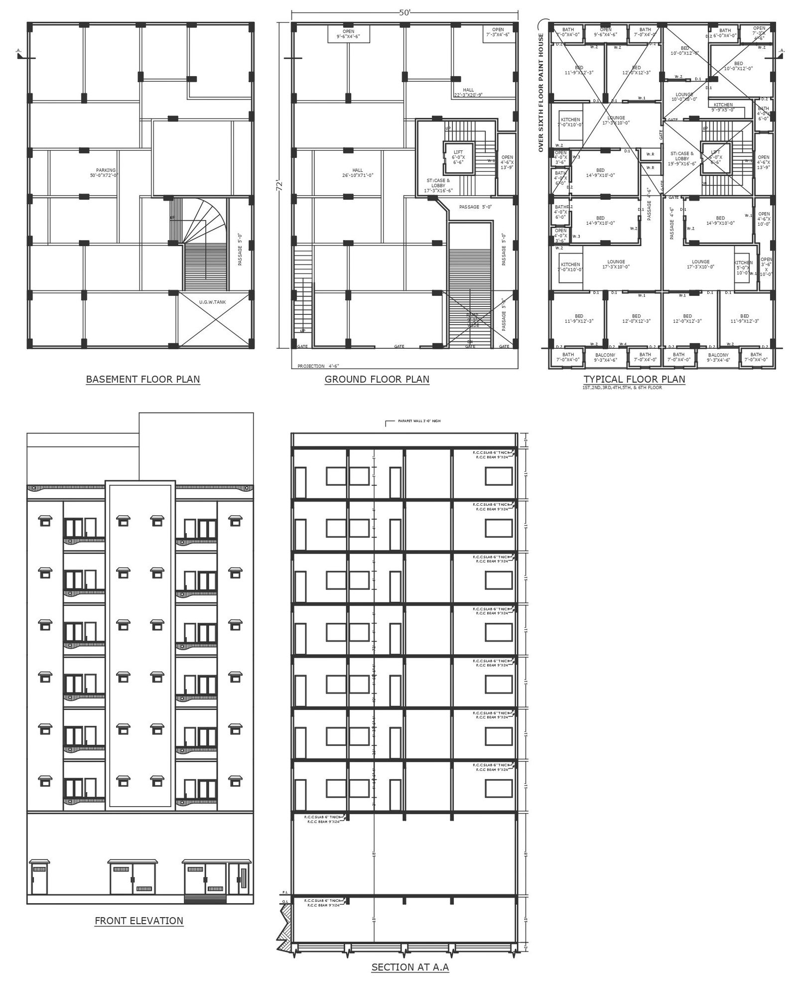 Typical floor plan for g plus 6 floor building with elevation section and other details dwg autocad drawing .