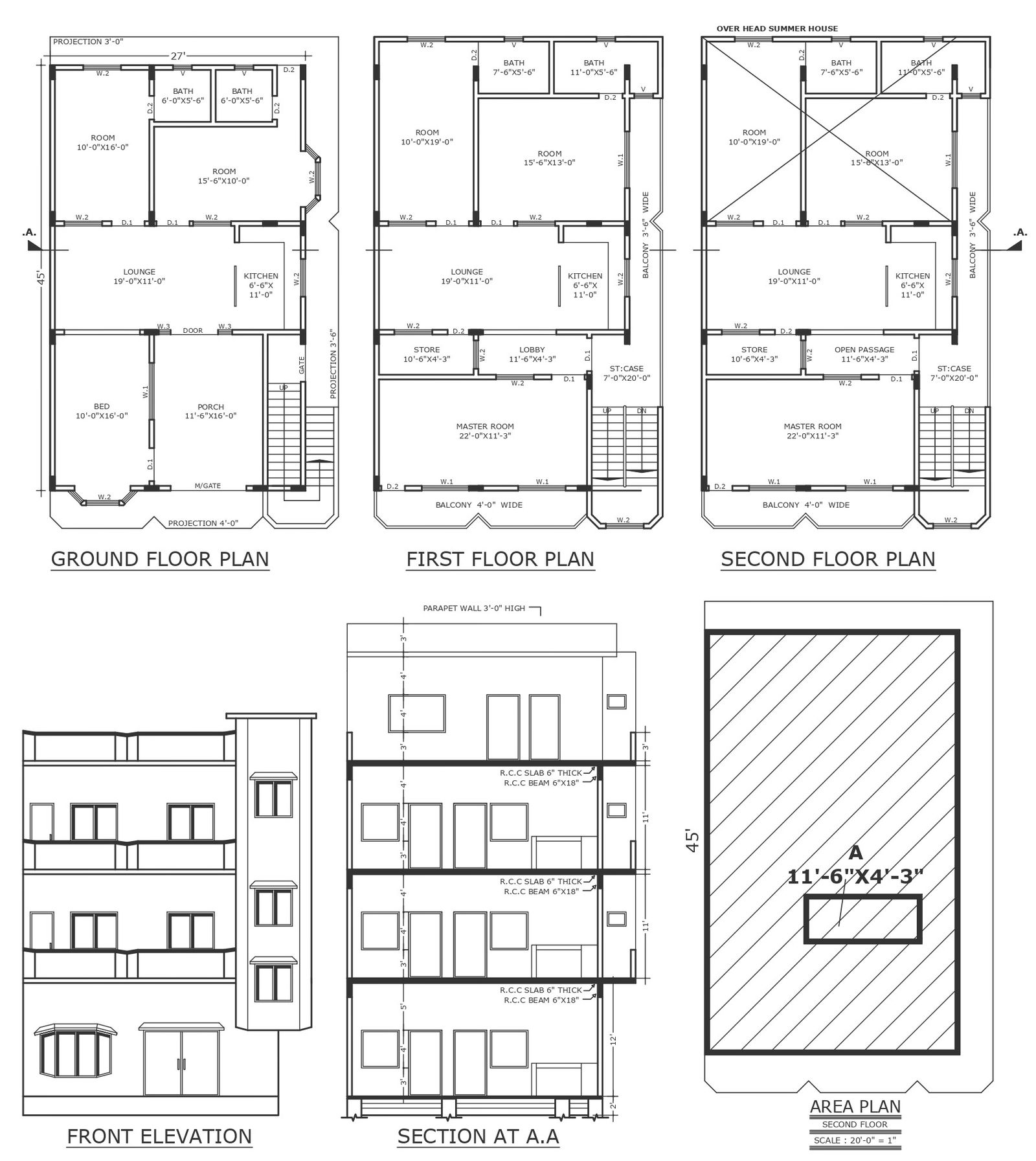 Ground first and second floor planning with given details and plot size with elevation and section details dwg autocad drawing .