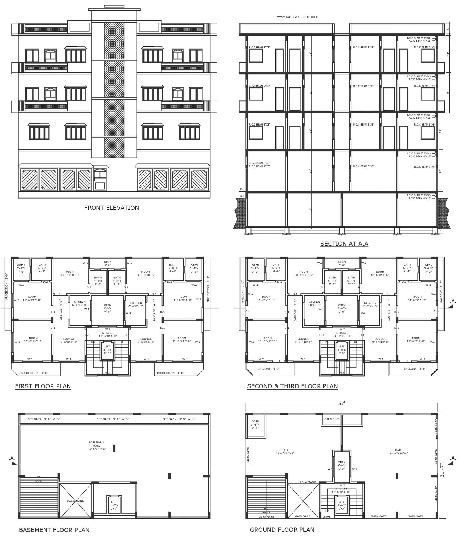 Basement ground first second third and terrace floor plan with elevation and section details dwg autocad drawing .