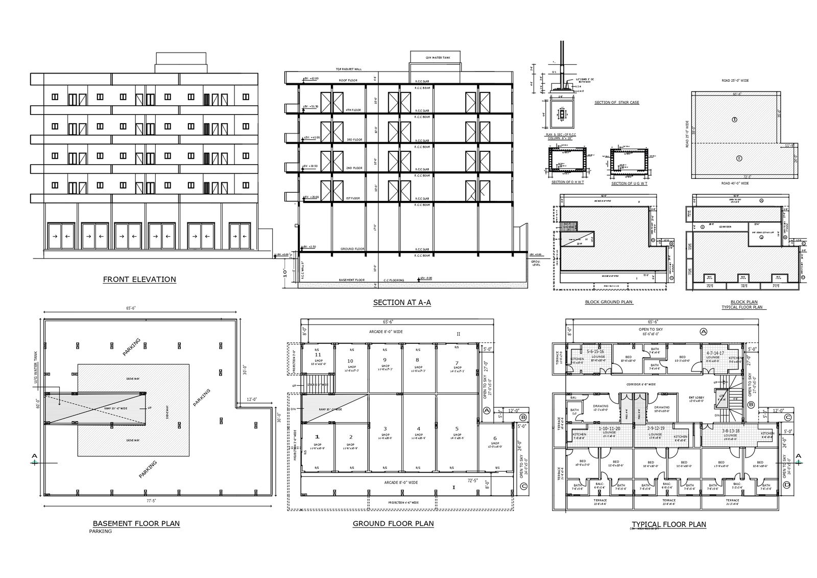 Block ground plan and block plan for typical floor plan with elevation section and other details dwg autocad drawing.
