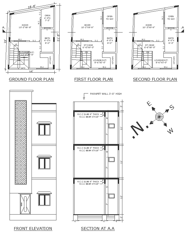 North west facing house plan with elevation section and other details dwg autocad drawing .