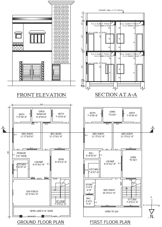 Ground floor plan first floor plan front elevation and section details dwg autocad drawing .