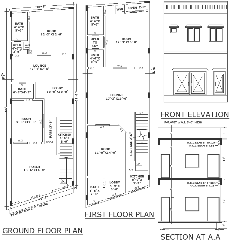 Projection on ground floor of first floor with floor plan elevation and details dwg autocad drawing