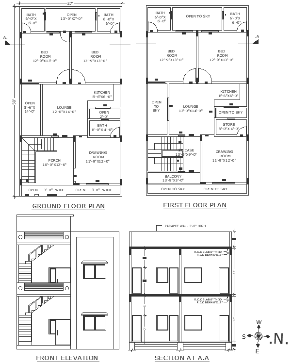 East facing house plan details with elevation section and house plan dwg autocad drawing .
