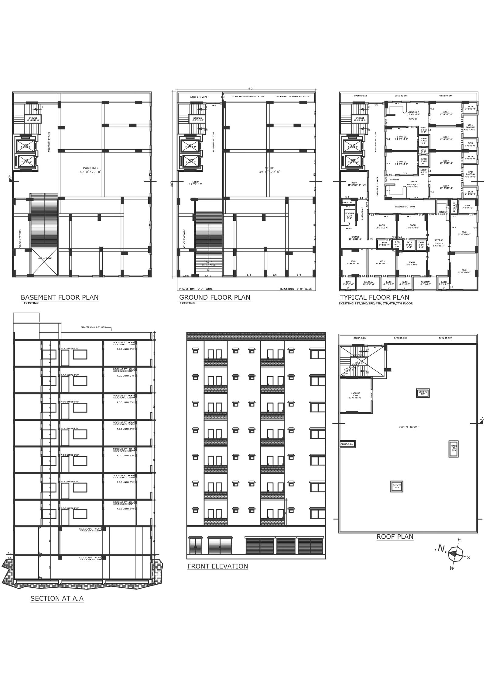 Basement ground plus 7 floor house plan design with elevation section details dwg autocad drawing .