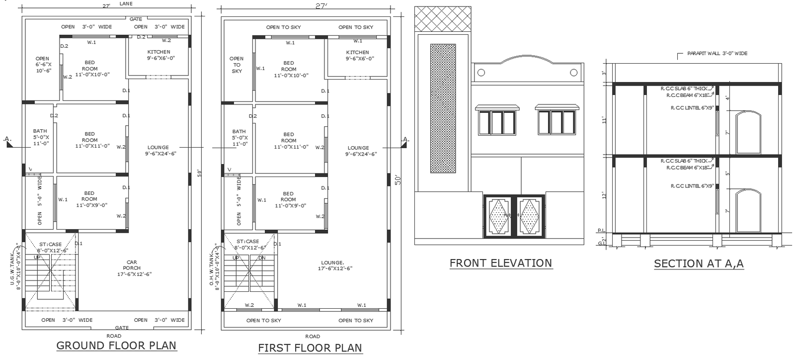 House with compound wall design with elevation and section detail dwg autocad drawing