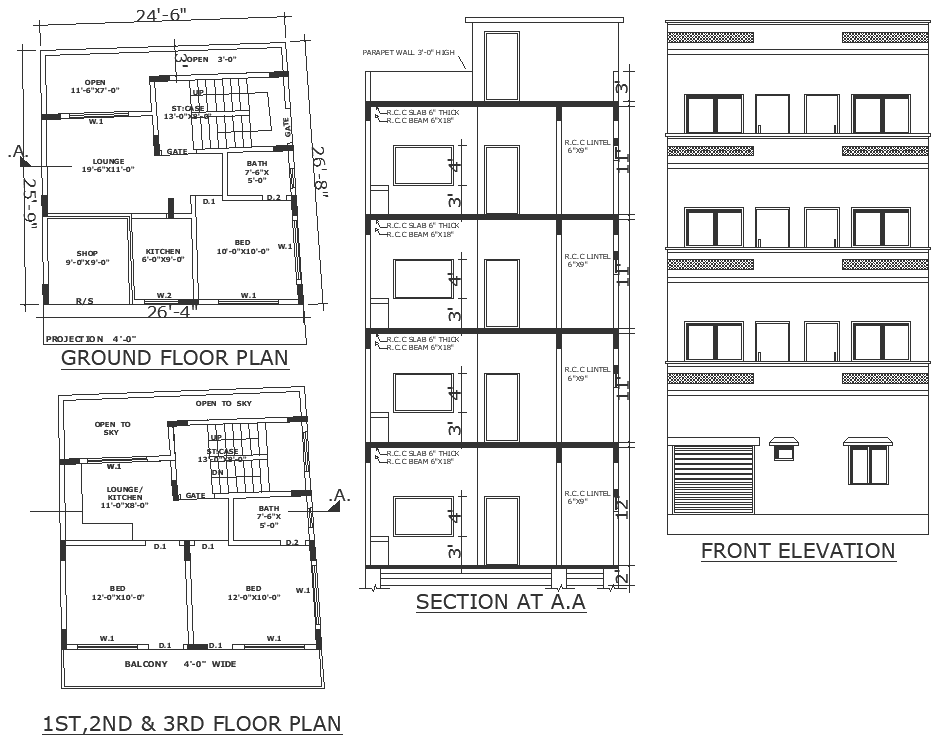 First second and third floor plan with elevation section and other details dwg autocad drawing .