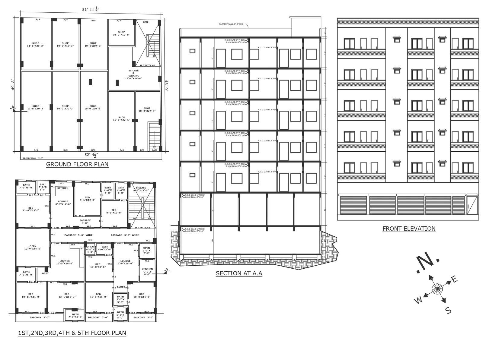 First second third fourth fifth floor plan with elevation section and other details dwg autocad drawing .