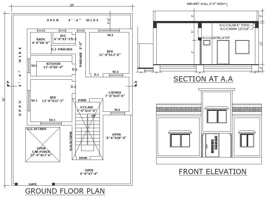 Single floor house plan with terrace plan elevation and section details dwg autocad drawing .