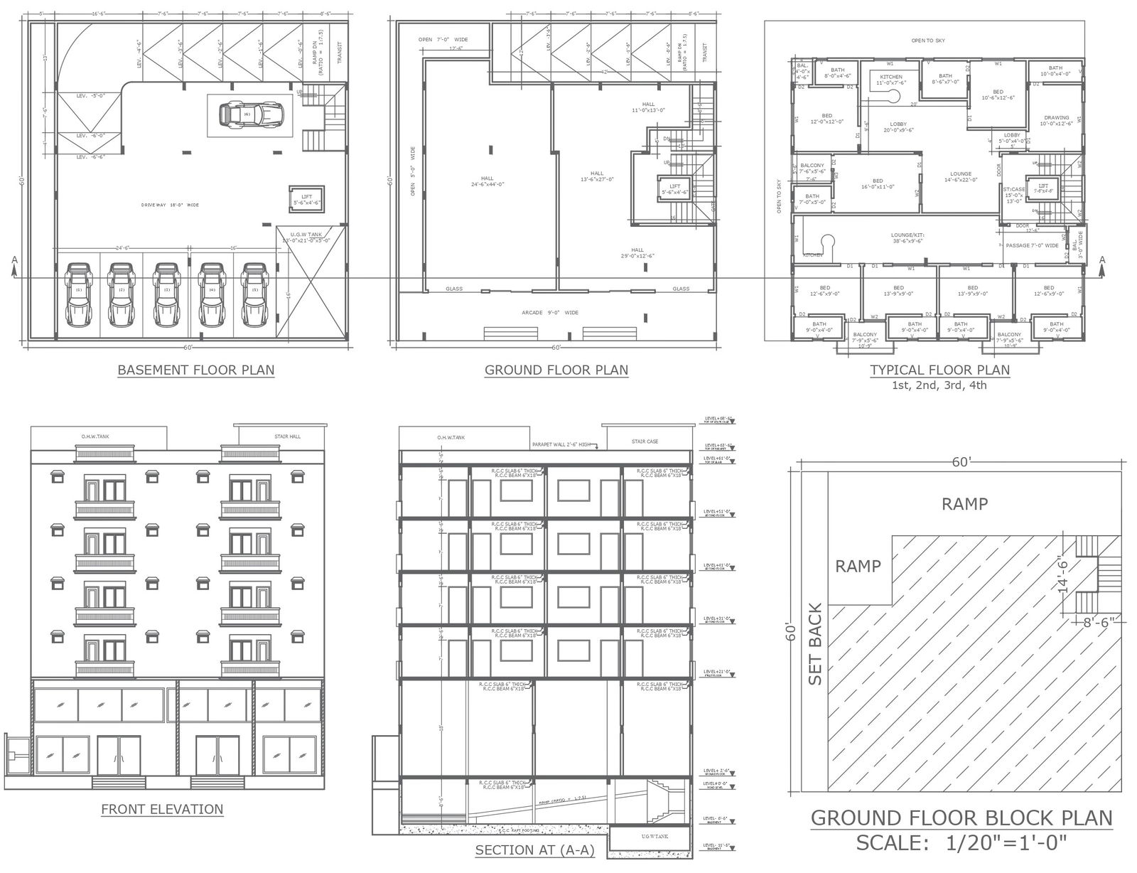 60ft X 60ft plot size, four floor hotel detailed plan, elevation and sections with attached balcony detail DWG AutoCAD drawing.