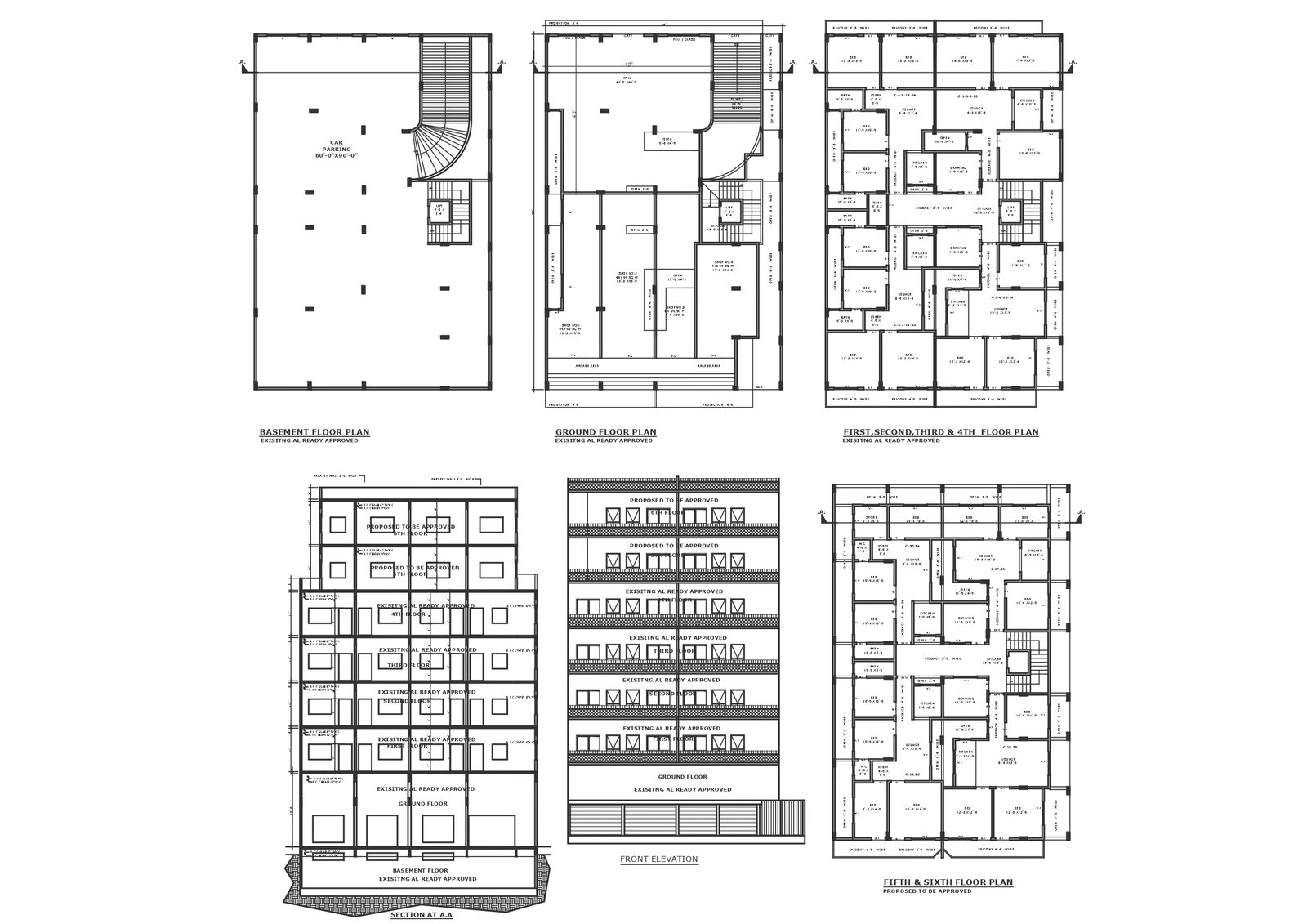 Six storey 4 BHK apartment design with shops on ground floor detailed each floor plan Section and front elevation DWG AutoCAD drawing