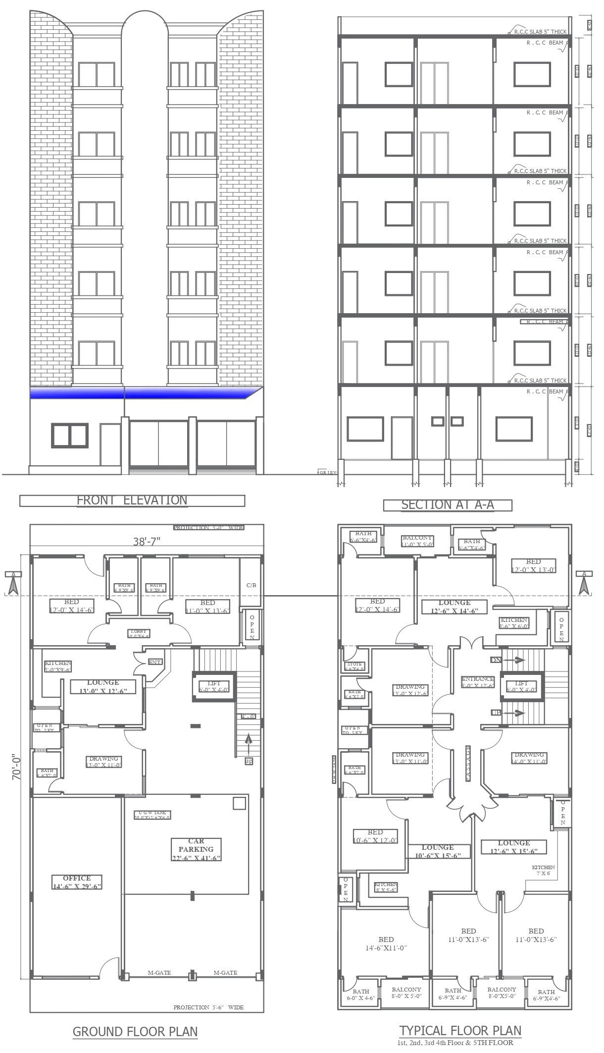 38.5ft X 70 ft plot size 5 storey 2 bhk apartment floor plan section and front elevation detail DWG AutoCAD drawing