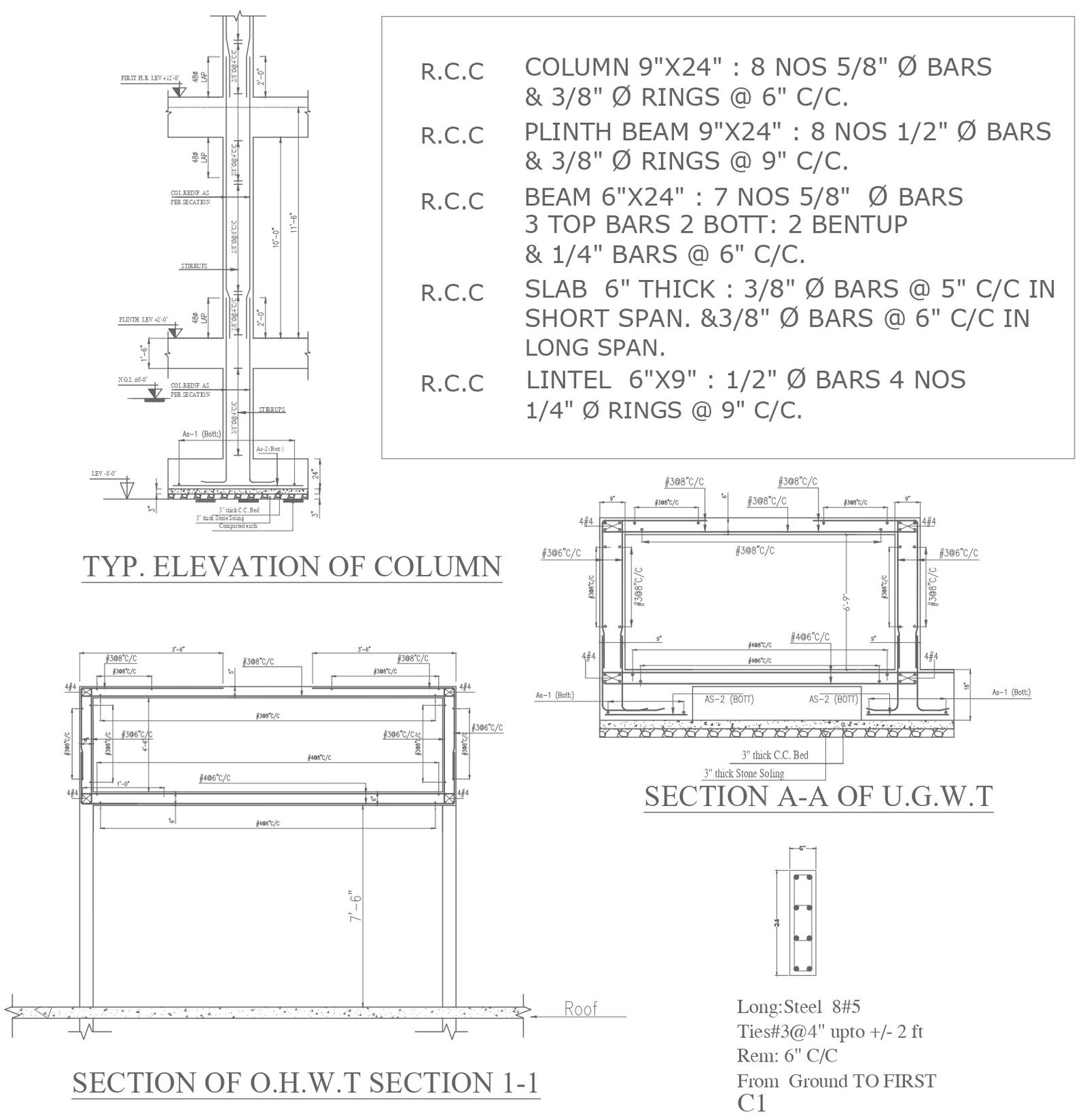 Section of underground and elevated water tank with tile details and elevation of column details DWG AutoCAD drawing