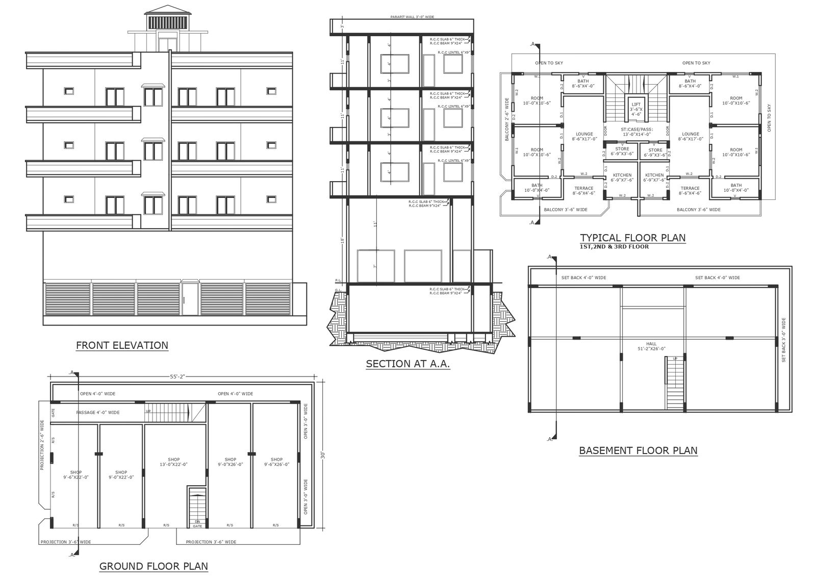 13ft X 14ft U shaed staircase detail in 2bhk three storey apartment plan section and elevation detail DWG AutoCAD drawing