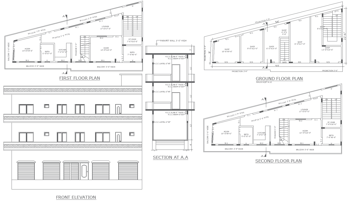 Two storey house plan with attached balcony all 3 side triangular plan section and elevation detail DWG AutoCAD drawing