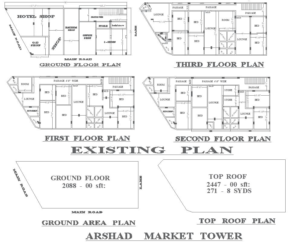 2088 sft three storey market tower dteailded plan with all measurement DWG AutoCAD drawing
