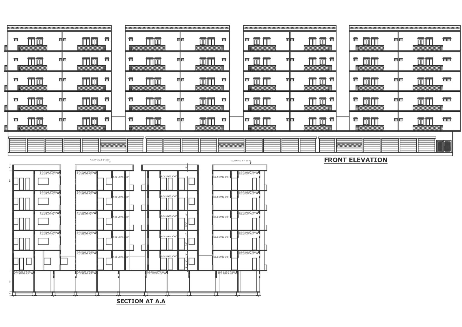 Front elevation and section details of two bhk five storey apartment with 8 wings layout DWG AutoCAD drawing