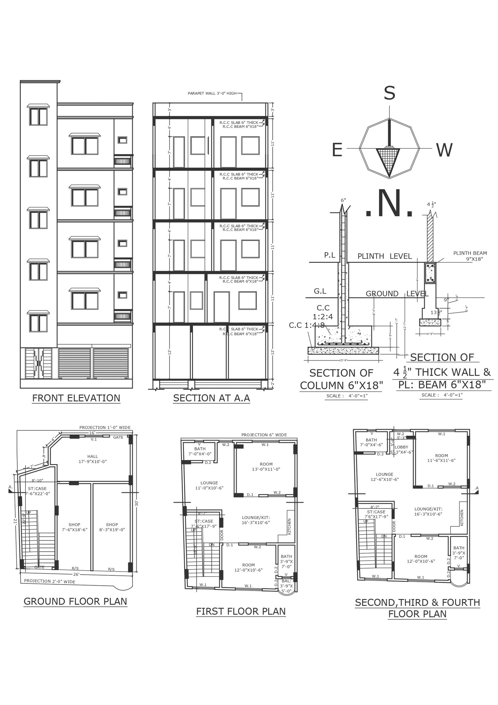 Two bhk 4 floor house plan elevation section drawing showcasing all small details of beam and column DWG AutoCAD drawing
