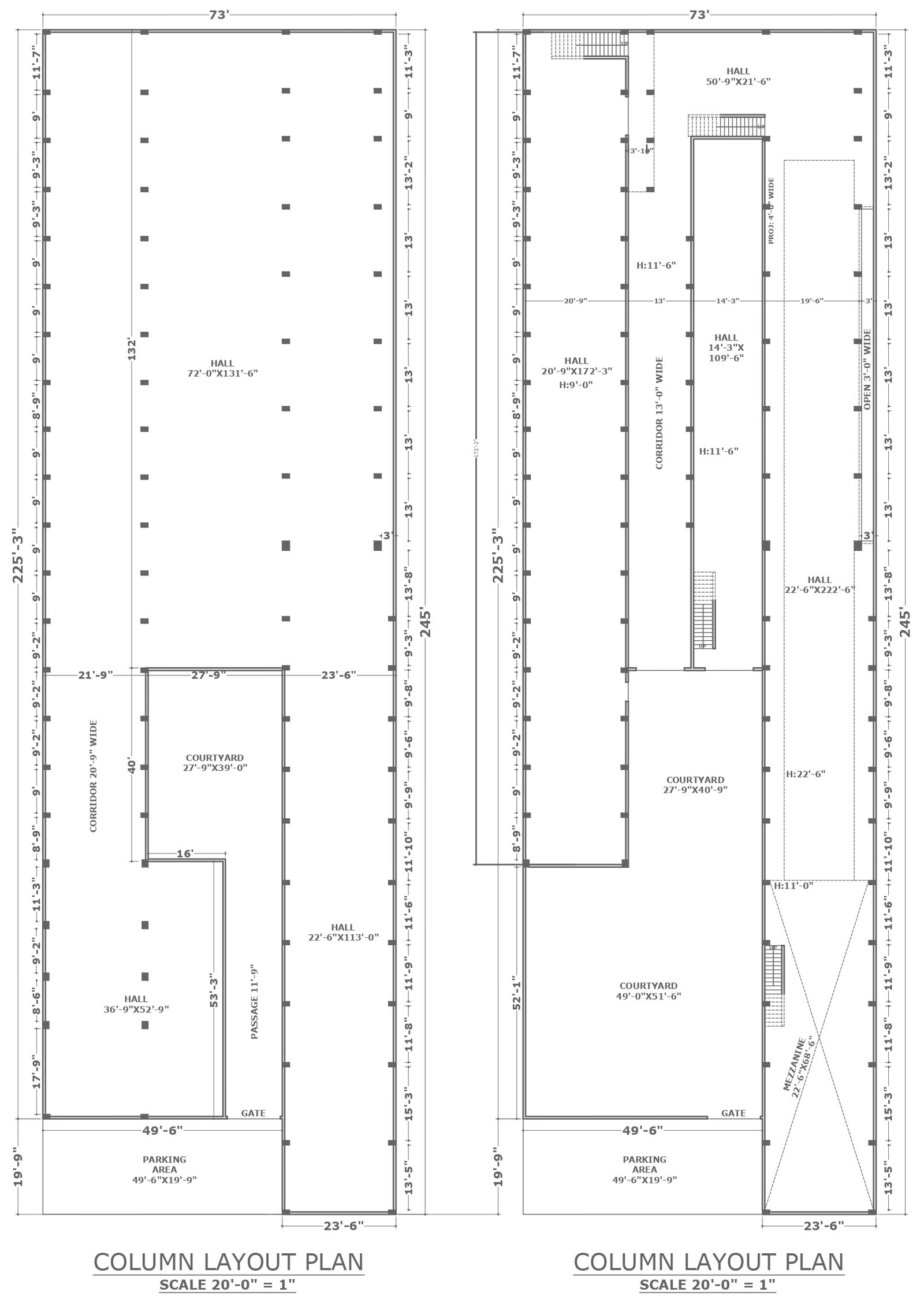 Column layout plan of plot size of 225ft X 73ft in scale DWG AutoCAD drawing