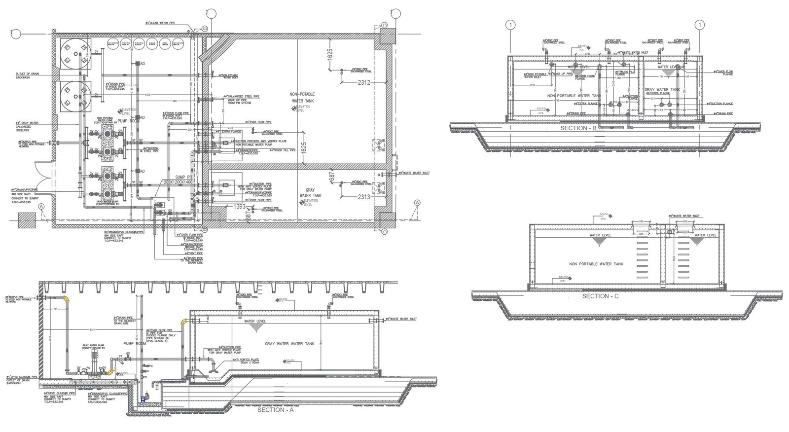 Plumbing detailed layout plan with multiple section details of water pump water tank and pipes DWG AutoCAD drawing