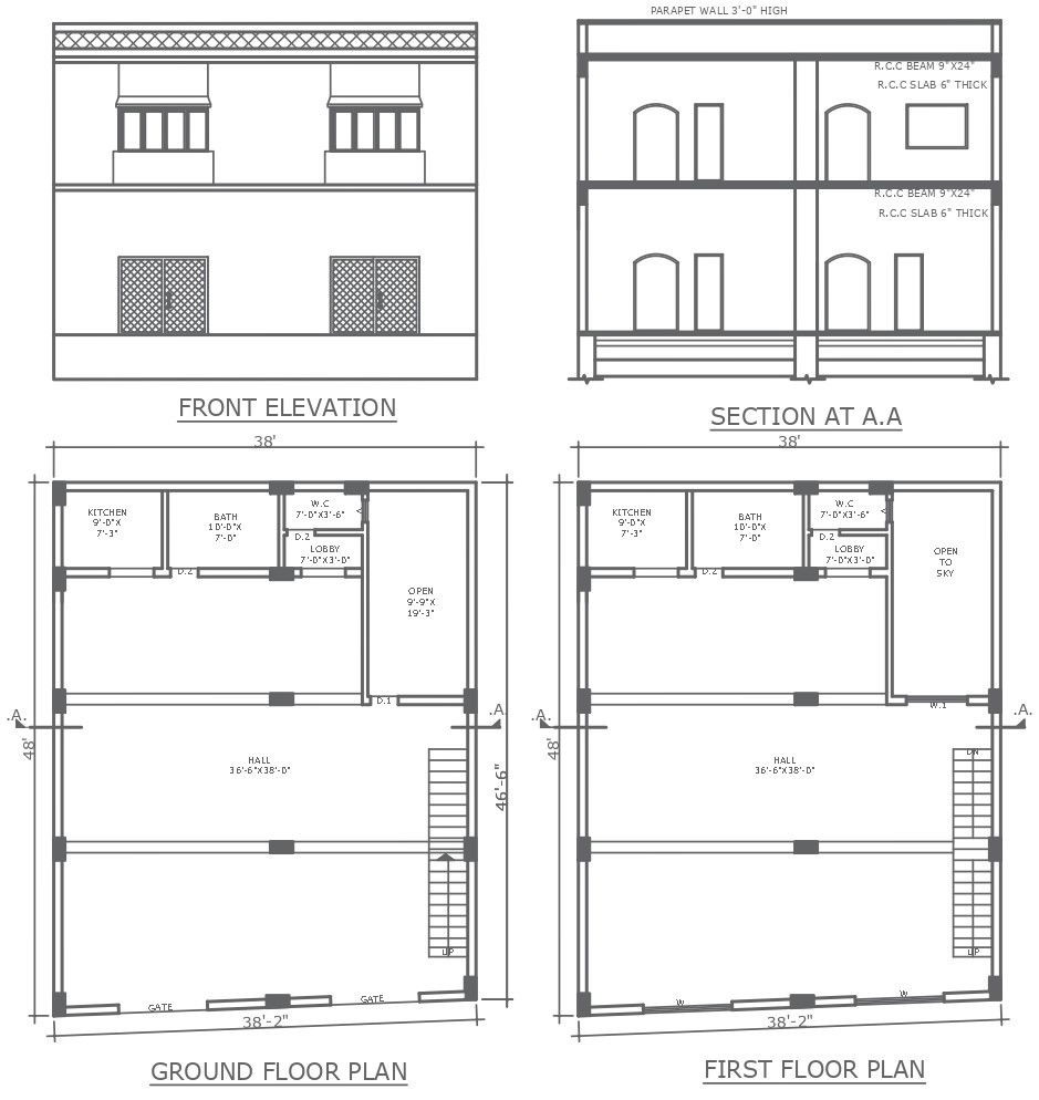 Detailed House Plan 38x48 in AutoCAD File with Section