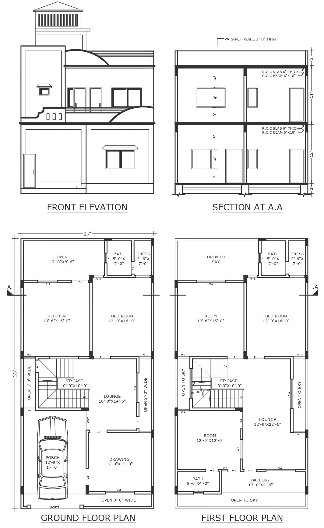 27 feet by 55 feet house plan design with elevation section and plot details dwg autocad drawing .